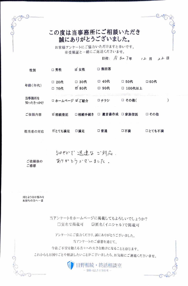 本件は公正証書遺言書があり、不動産の相続人が指定されておりましたので、すぐにお手続きを進めることができました。