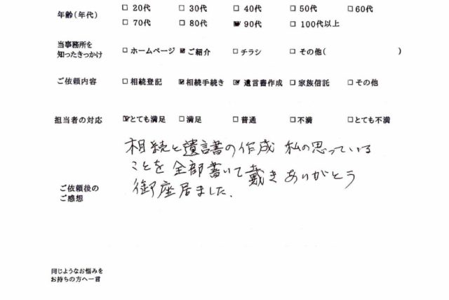 ~メッセージ~ 先日ご依頼いただいたご依頼者様のご友人で、遺言書作成を検討しているとのことでご紹介い