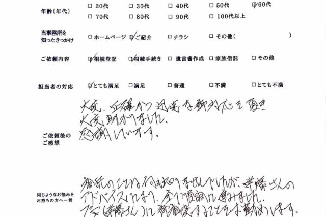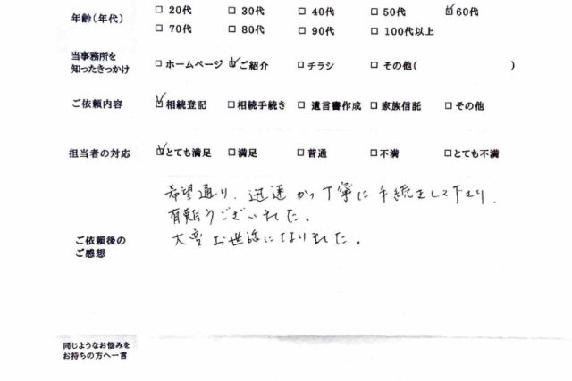~メッセージ~ 無料相談会でご相談を受け、その後に相続登記スタンダードプランをご依頼いただきました。